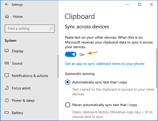 - 选择剪贴板从左窗格中。打开右侧下方的切换按钮跨设备同步启用剪贴板同步。
