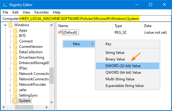 HKEY_LOCAL_MACHINE\SOFTWARE\Policies\Microsoft\Windows\System。在右侧窗格的空白区域上单击鼠标右键,然后选择新的->DWORD(32 位)值。