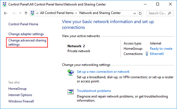 在网络和共享中心的左侧窗格中,单击更改高级共享设置关联。