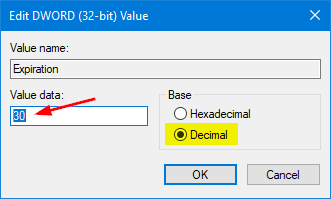 - 将新的 DWORD 值命名为到期日,然后双击进行修改。