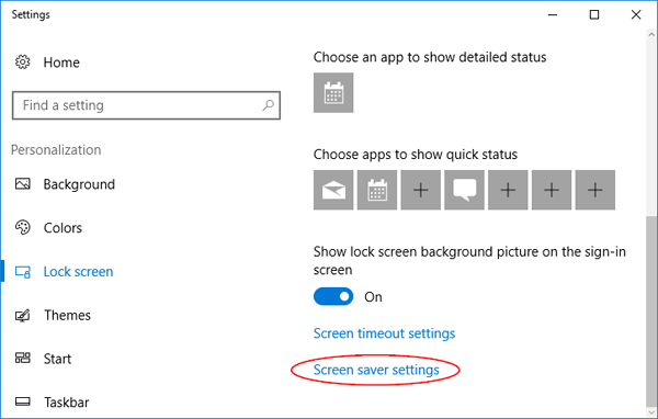 - 现在它打开个性化设置。点击锁屏在左侧窗格中,然后单击屏幕保护程序设置右侧窗格中的链接。