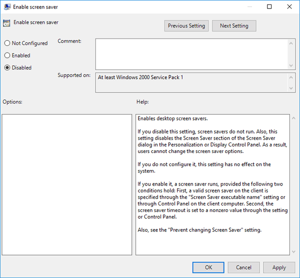 - 将其设置为残疾人如果你想关闭屏幕保护程序。禁用后,所有屏幕保护设置选项将变灰。如果您想稍后打开屏幕保护程序,则需要将该选项设置为启用。