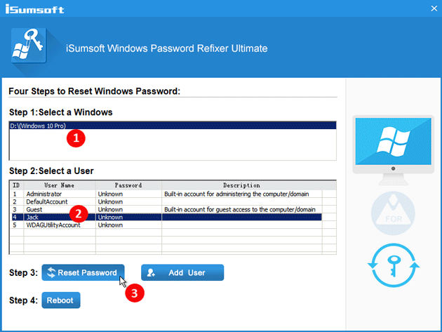 如果您从该密码重置磁盘正确启动了锁定的 HP 笔记本电脑,则 Windows 密码修复程序将起作用。它显示 HP 笔记本电脑上运行的 Windows 10 操作系统,并列出笔记本电脑上现有的所有用户帐户。您只需选择Windows 10操作系统以及要重置密码的用户帐户,然后单击“重置密码”按钮,然后按照提示重置密码。
