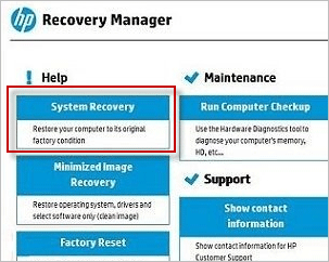 步骤 3:现在您已进入“HP Recovery Manager”,从“帮助”或“我需要立即帮助”部分选择“系统恢复”。 HP Recovery Manager 的屏幕可能因型号而异。