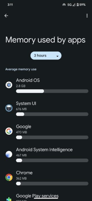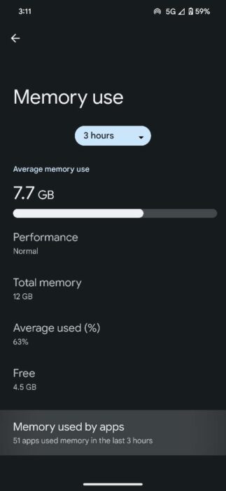 顾名思义,此选项允许用户检查各种应用程序在手机上的平均内存使用情况。此外,用户还可以通过访问“应用程序使用的内存”部分来自定义时间范围并查看每个应用程序的平均使用情况。