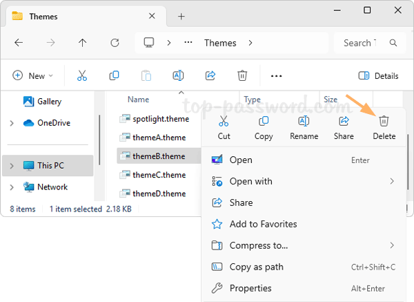 - 右键单击每个主题,您将看到“删除”按钮,该按钮允许您一次删除主题。如果“删除”按钮呈灰色,表示该主题是 Windows 11 上预装的默认主题或者是当前活动的主题。