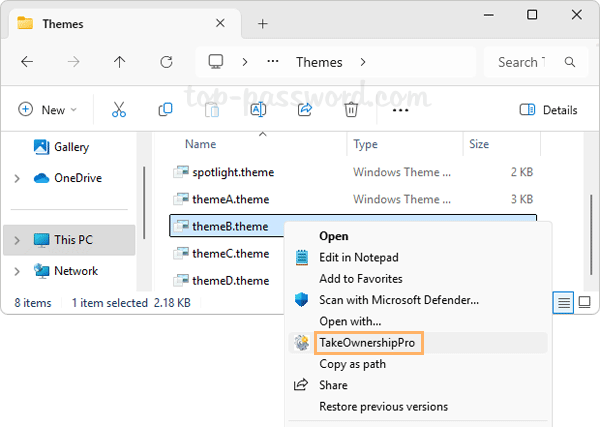- 默认情况下,这些 .theme 文件不能直接删除。您需要首先授予您当前的Windows帐户完全权限。为了简化此过程,您可以使用免费软件 TakeOwnershipPro。安装后,只需右键单击那些 .theme 文件并选择“显示更多选项” -> “取得所有权专业版”。