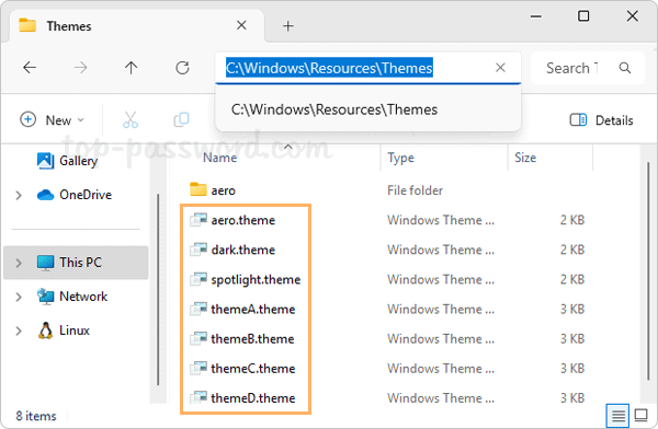 C:\Windows\Resources\Themes。每个主题都由一个扩展名为“.theme。您可以双击其中之一以立即应用主题。