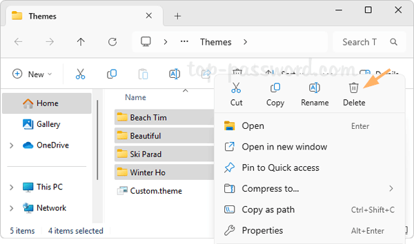- 要删除所有已安装的主题,只需选择所有这些文件夹,右键单击它们并选择删除。此方法还可以删除系统上当前活动的主题。