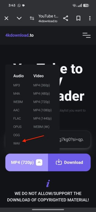 如前所述,诸如yout.com和4KDownload。在移动浏览器上无缝工作,从而轻松在Android和iOS设备上以WAV格式下载YouTube视频。这是: