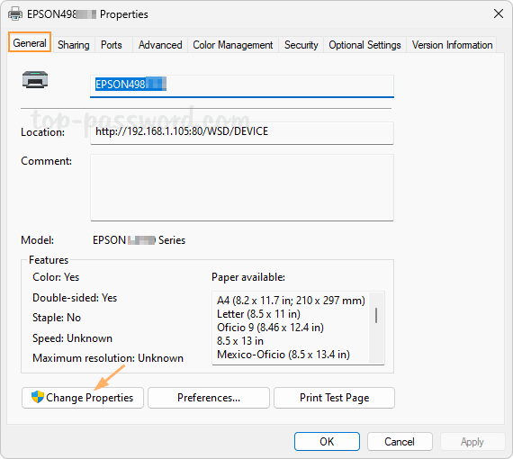 - 默认情况下,无法编辑或更改打印机名称。您需要点击“更改属性”按钮位于底部。