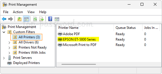 - 扩展到自定义过滤器->所有打印机,您将看到 PC 上可用的打印机列表,包括虚拟打印机。