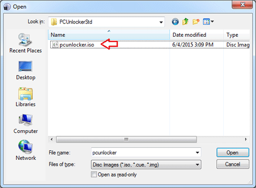 - 选择Pcunlocker ISO图像文件,然后单击打开。