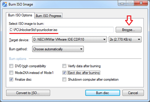 - 单击浏览按钮打开一个窗口,您可以在其中导航到pcunlocker.iso文件。选择文件后,单击“打开”按钮。现在,您将在同一屏幕上,但是现在您希望燃烧的ISO被选择。