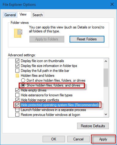提示:如果您想显示隐藏的操作系统文件,请清除复选框“隐藏受保护的操作系统文件(推荐)',并确认警告对话。