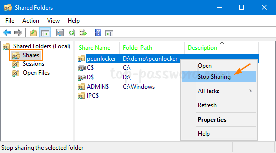 - 在左窗格中,选择“股票“。在右边,您会在本地系统上看到所有共享文件夹。右键单击您不再想要共享的文件夹,然后选择“停止共享“。