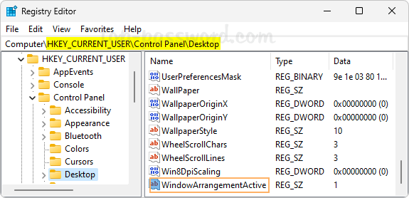 HKEY_CURRENT_USER\Control Panel\Desktop,然后双击字符串WindowRangementActive在右窗格上。