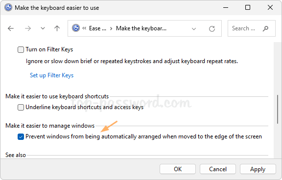 - 向下滚动到“使管理窗口更容易管理”部分,取消选中“移动到屏幕的边缘时,请防止窗户自动排列“ 选项。