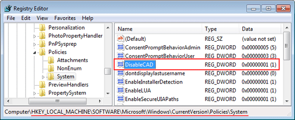 HKEY_LOCAL_MACHINE\SOFTWARE\Microsoft\Windows\CurrentVersion\Policies\System - 您应该会看到一个名为的 DWORD(32 位)条目禁用CAD在右窗格中。双击它并将其值从 0 更改为 1。