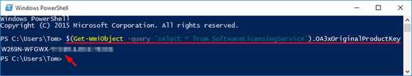 $(Get-WmiObject -query 'select * from SoftwareLicensingService').OA3xOriginalProductKey