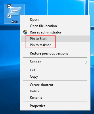 首先,您需要在 Windows 10 桌面上创建“运行”命令的快捷方式。完成后,右键单击“运行”快捷方式,您可以找到将“运行”固定到“开始”菜单和任务栏的选项。