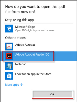 第 2 步:在标题为“你想如何打开这个文件',选择一个程序,例如Adobe Acrobat 阅读器打开 PDF 文件,然后勾选“”旁边的复选框始终使用此应用程序打开 .pdf 文件” 将所选程序设置为默认 PDF 查看器,然后单击好的。