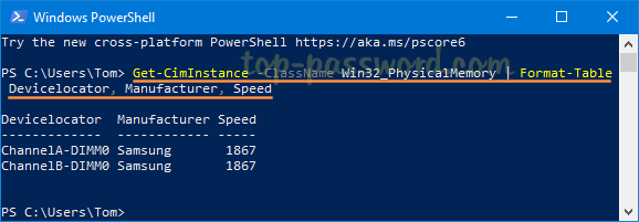 Get-CimInstance -ClassName Win32_PhysicalMemory | Format-Table Devicelocator, Manufacturer, Speed