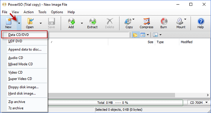 步骤1:安装PowerISO并打开它。然后展开“新的”选项并选择数据 CD/DVD。
