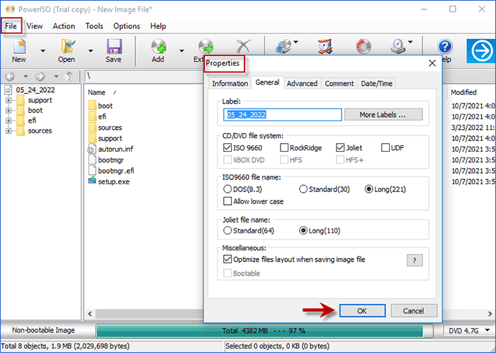 第三步:点击文件 > 属性根据需要修改ISO信息,点击好的以确认更改。