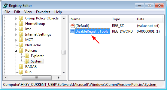 HKEY_CURRENT_USER > SOFTWARE > Microsoft > Windows > CurrentVersion > Policies > System如果系统密钥不存在,您需要创建它。