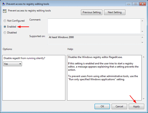 此方法将阻止所有用户访问注册表编辑器,包括您自己。要重新获得对注册表编辑器的访问权限,您必须再次打开组策略编辑器,并将策略更改为残疾人或者未配置。