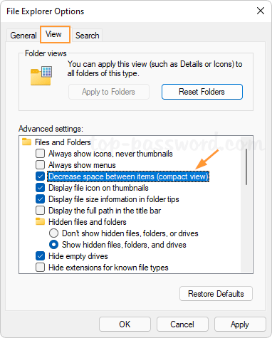前往看法选项卡。在高级设置下,选中“减少项目之间的空间(紧凑视图)”以打开紧凑视图,或取消选中它以关闭紧凑视图。