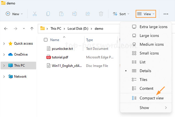 打开文件资源管理器后,单击看法顶部功能区菜单中的图标。然后您可以单击紧凑视图选项以启用紧凑视图,或再次单击该选项以禁用紧凑视图。