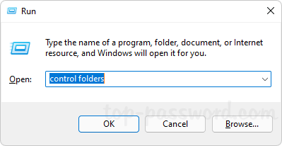 按视窗键+右启动“运行”对话框。接下来,输入控制文件夹在文本字段中,然后单击好的打开文件夹选项窗口。