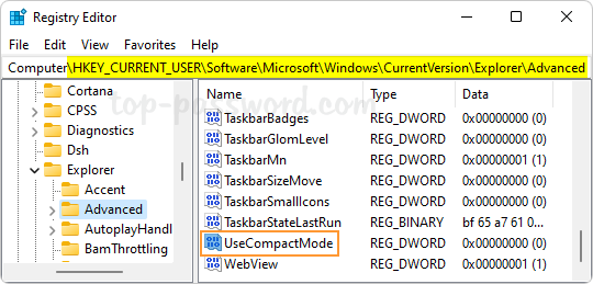 打开注册表编辑器并浏览到:HKEY_CURRENT_USER\Software\Microsoft\Windows\CurrentVersion\Explorer\Advanced。在右侧窗格中,双击名为的 32 位 DWORD使用紧凑模式。