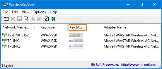 WirelessKeyView 是 NirSoft 创建的免费便携式工具,可用于恢复 Windows 10 / 8 / 7 中存储的所有无线网络安全密钥/密码 (WEP/WPA)。打开该程序后,它将向您显示 PC 上配置的所有 Wi-Fi 网络的详细信息。
