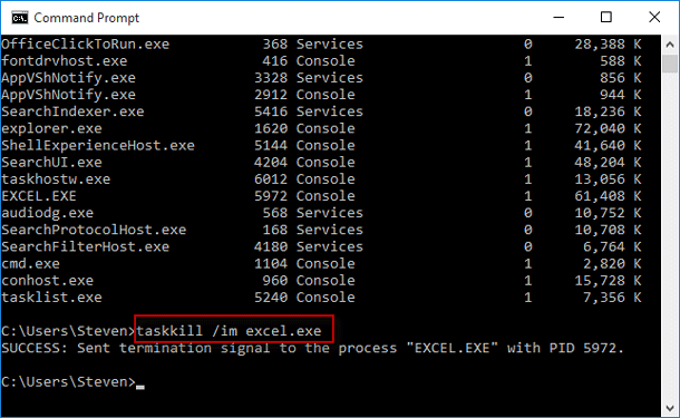 步骤3:输入taskKill /im program_name.exe然后按进入钥匙。例如,在我的情况下,我想强制Excel程序(IE Excel.exe)退出TaskKill /im excel.exe然后按进入。如果一切顺利,该命令将成功运行,并且消息“使用PID 5972将终止信号发送到过程excel.exe”显示在屏幕上。PID表示由Windows系统定义的过程ID。