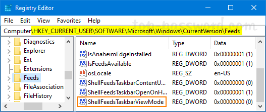 打开注册表编辑器并导航至:HKEY_CURRENT_USER\Software\Microsoft\Windows\CurrentVersion\Feeds。在右侧,双击ShellFeeds任务栏查看模式修改数值数据。