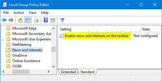 打开本地组策略编辑器并浏览到:Computer Configuration -> Administrative Templates -> Windows Components -> News and interests。在右侧窗格中,双击“在任务栏上启用新闻和兴趣“ 政策。