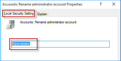 第 3 步:随着“本地安全设置选择“选项卡,管理员帐户的名称将突出显示并可编辑。在字段中键入新名称,然后单击“应用”,然后单击“确定”以重命名管理员帐户。