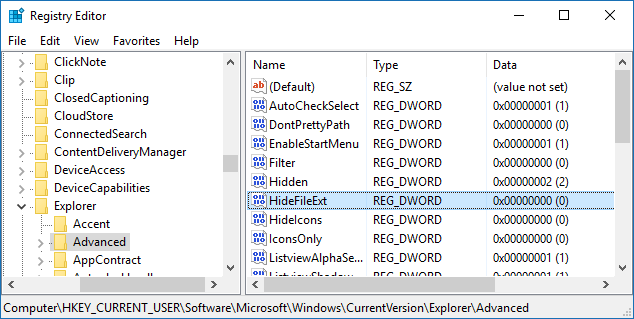 您可以在注册表编辑器中更改注册值数据,以使其显示或隐藏您的文件扩展名。