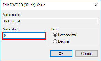 步骤 4:要显示隐藏文件扩展名,请将其值设置为“0”。
