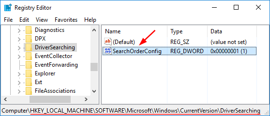 - 导航至HKEY_LOCAL_MACHINE\SOFTWARE\Microsoft\Windows\CurrentVersion\DriverSearching。双击搜索订单配置右侧窗格中的条目。