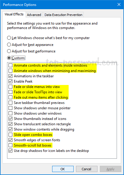 - 在“性能选项”对话框中,您将看到一长串复选框选项,可让您调整系统的视觉效果。要禁用动画,我们建议取消选中以下选项: