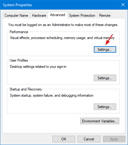 - 选择先进的选项卡。单击设置性能部分下的按钮。