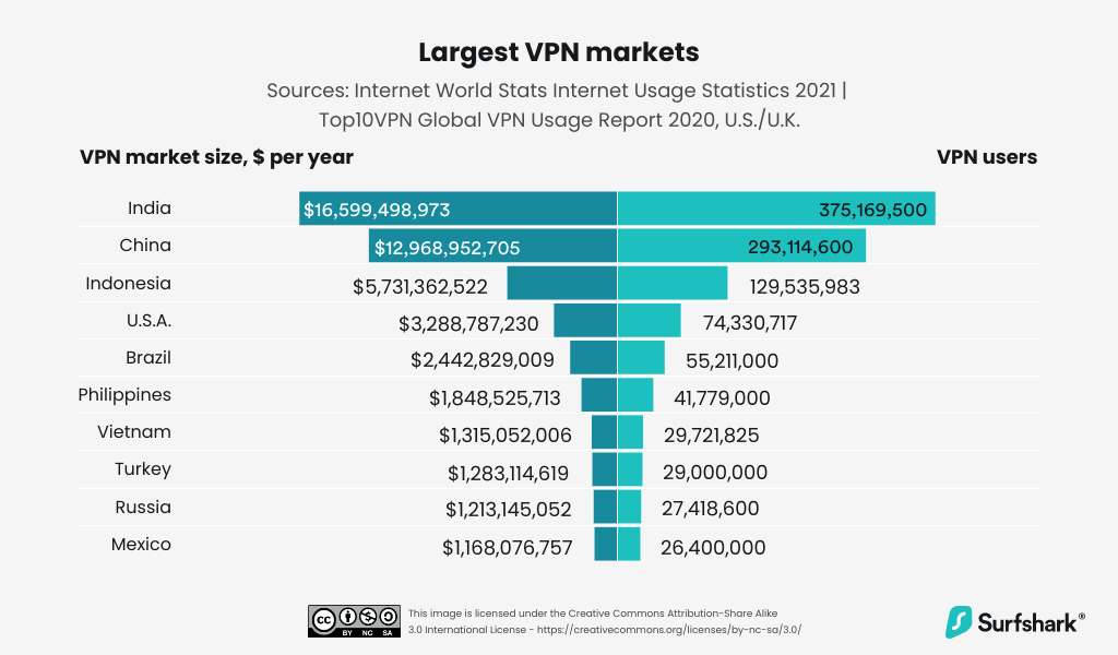 据 Surfshark 称,按国家划分,全球最大的 VPN 市场都在亚洲:印度、中国和印度尼西亚。