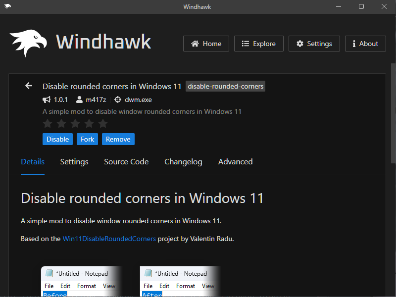 Win11DisableRoundedCorners 是一个简单的工具,只需单击一下即可禁用圆角。