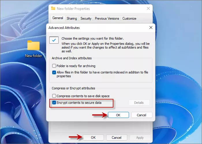 3. 勾选加密内容以保护数据复选框并单击好的。然后确认申请在“属性”窗口中并选择将更改应用到此文件夹、子文件夹和文件。最后点击好的并且您的文件夹将被加密,无法从其他用户帐户访问。