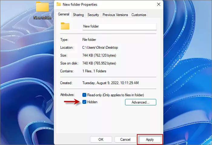 1. 右键单击该文件夹并选择特性在上下文菜单上。然后勾选隐复选框并单击申请。