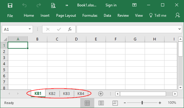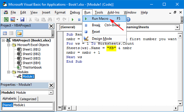- 您的所有工作表选项卡都将快速重命名为新名称,例如“KB1”。您可以更改 VBA 代码以将工作表重命名为您想要的名称。